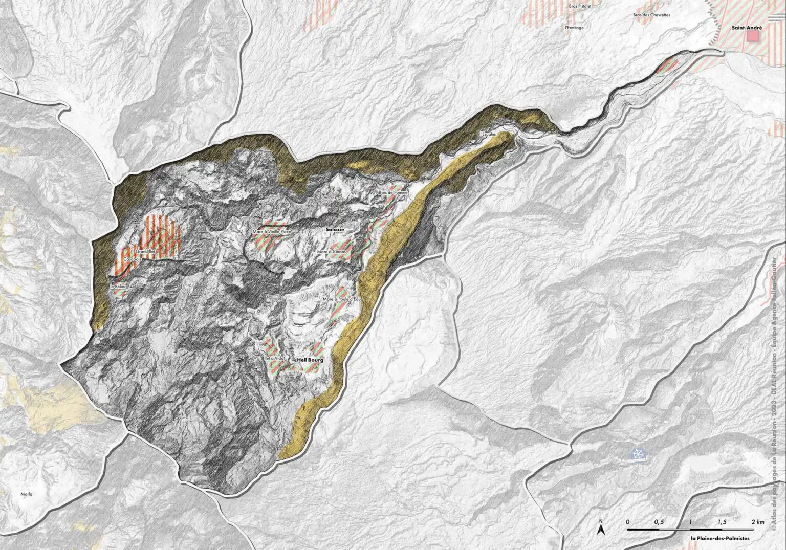 - Grand Ilet, aboutissement de la découverte du cirque. Création d’une structuration forte et hiérarchisée par le végétal de cet îlet à la structure très disloquée, mise en scène de l’entrée et de la rue principale…