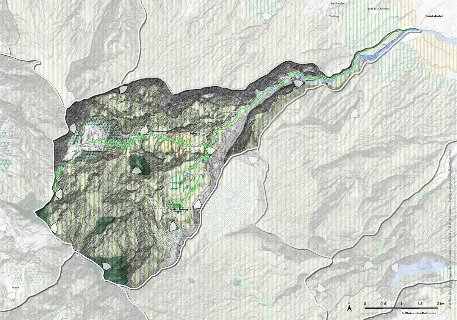 - Confortement de la centralité linéaire des routes lignes de vie ou des espaces publics des bourgs et îlets : Grand Ilet, Mare à Vieille Place, Salazie...