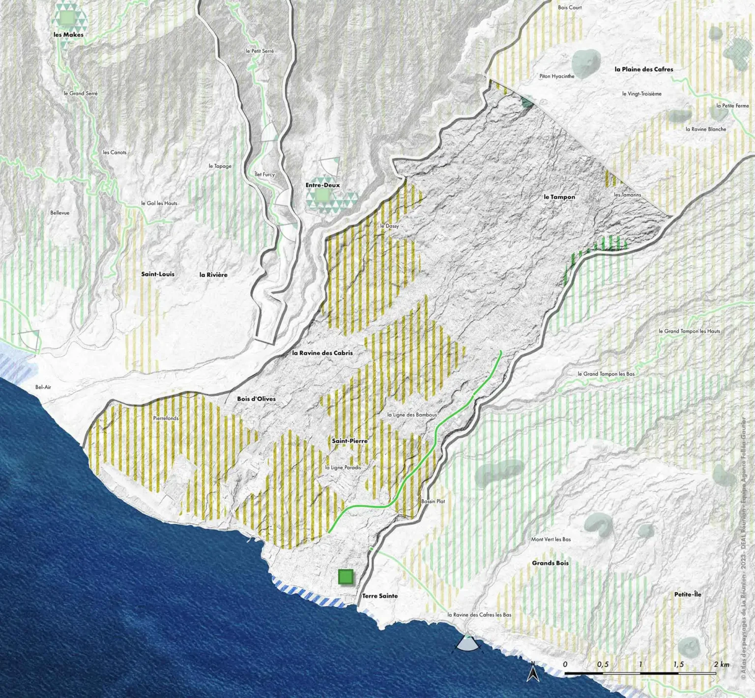 - Création de limites agro-urbaines franches de façon à préserver les zones agricoles encore existantes : les pentes entre la Ravine des Cabris et Trois Mare, le bord du rempart du Bras de la Plaine entre la Ravine des Cabris et le Bras de Pontho, les terres entre lignes des Bambous et lignes Paradis. Concept de "parcs agricoles" pérennisés.