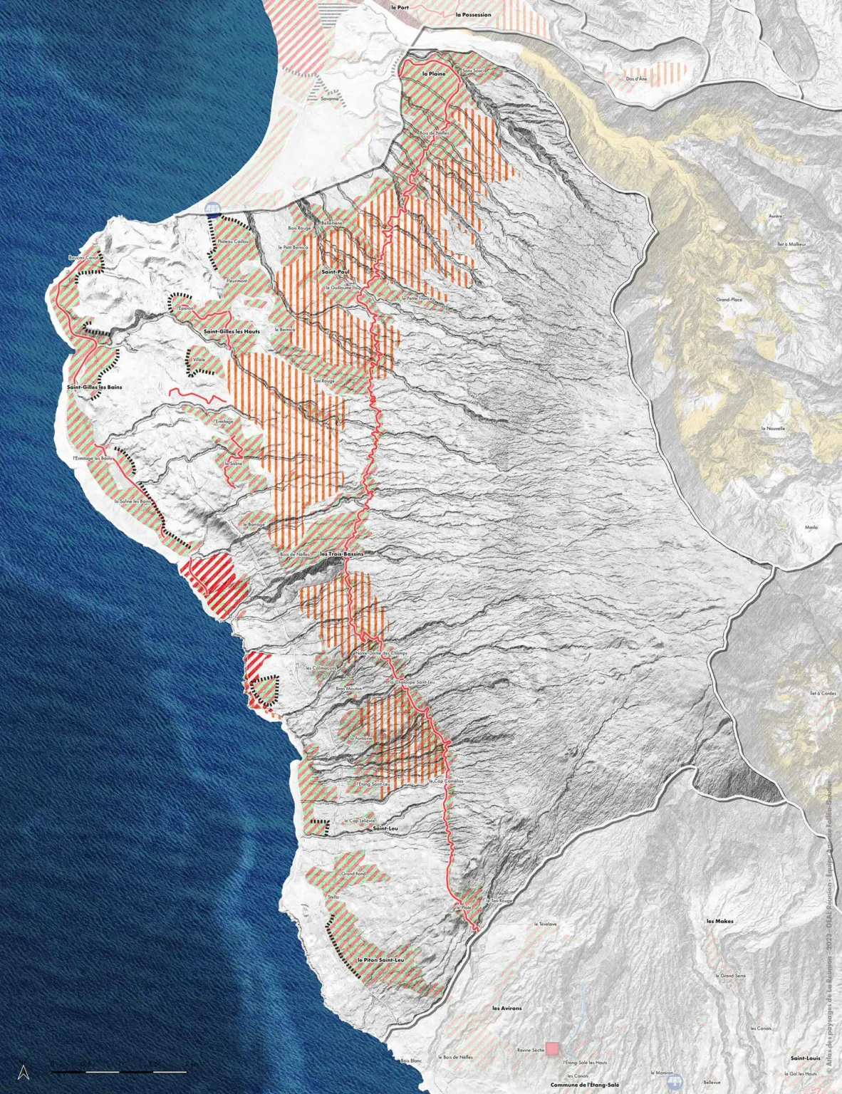 En amont du littoral, les pentes des stations balnéaires sont mitées par une urbanisation dense marquée par l’impact des lotissements (coteaux de Saint-Gilles-Les-Bains, pentes amont de La Saline). Ce phénomène fragilise le lagon et les zones humides en amont.
