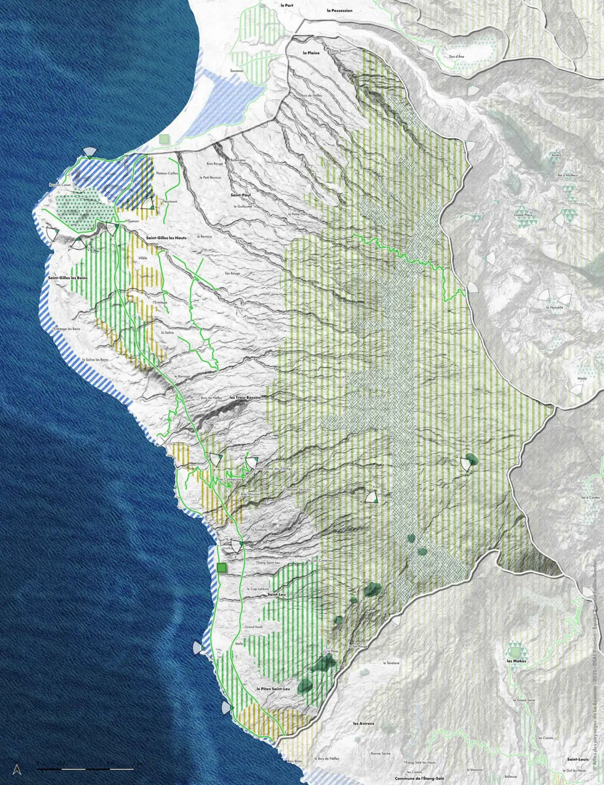 - Conserver des « coupures » entre les noyaux urbains des mi-pentes en valorisant le patrimoine agricole : espaces de respiration fragiles entre le Barrage et la Saline, l'Hermitage et Villèle, Villèle et Saint-Gilles-les-Hauts, Colimaçons et Bras Mouton etc.